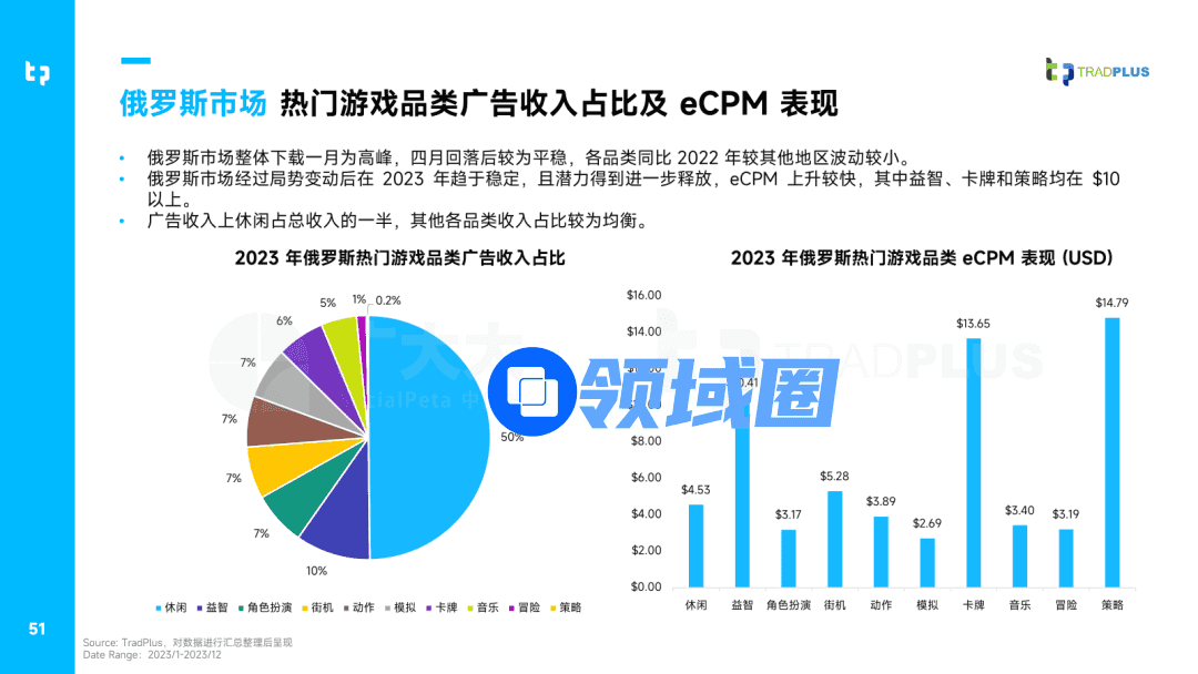 本次白皮书中TradPlus还对全球热门市场和游戏品类的变现表现做出了详细解读: