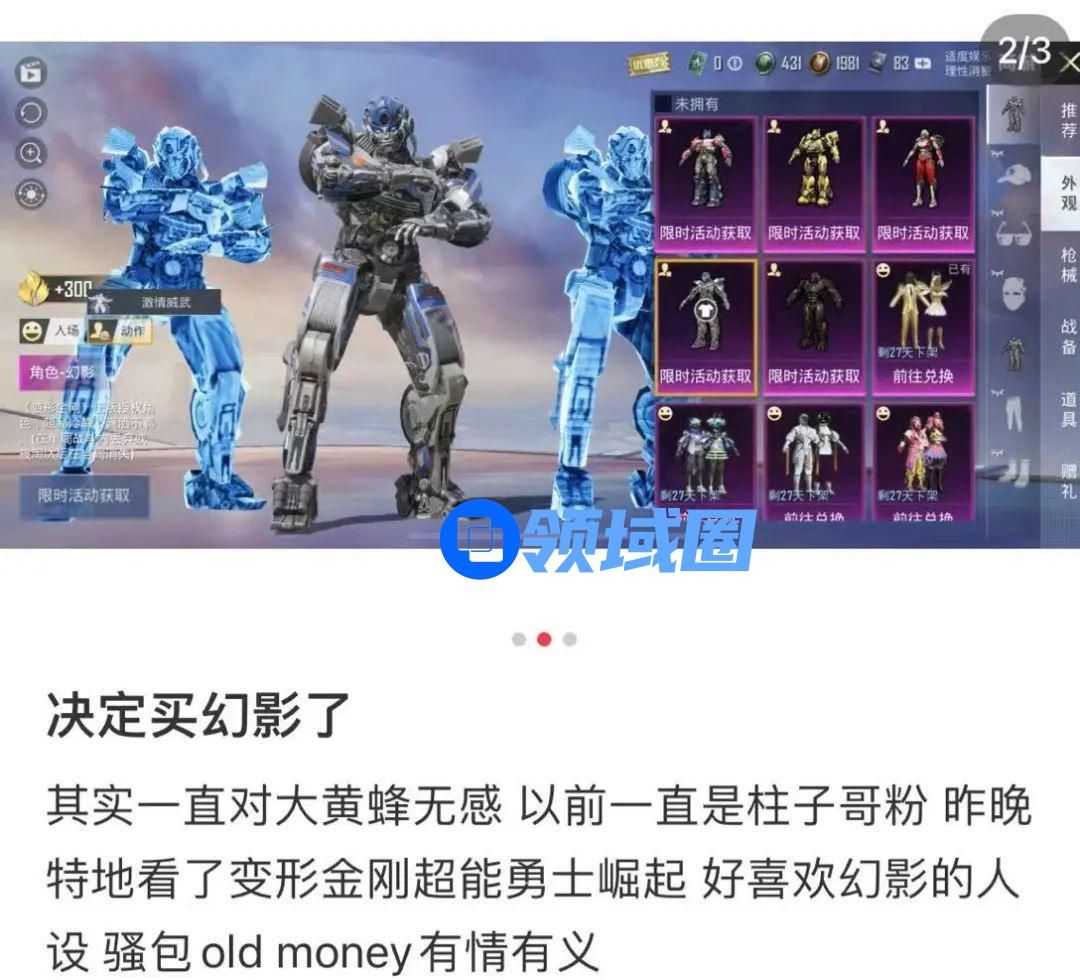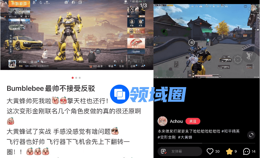 作为电影系列的主角,玩家率先奔向了擎天柱和大黄蜂。在《和平精英》初代电影中,与主角初遇的大黄蜂就赢得了不少玩家的喜爱。玩家表示“大黄蜂最帅,不接受反驳”,并拍摄分享了大黄蜂在实战中的“英姿”,表示胖乎乎的很可爱。