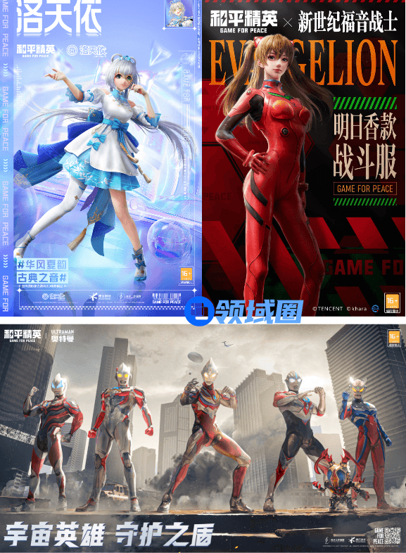 茶馆通过梳理过往联动发现,《和平精英》自上线以来在文化产业领域就与动漫、游戏、国创等多个重磅IP展开联动,涵盖了玩家在精神领域的不同追求。对于机甲爱好者来说,《和平精英》与《机动战士高达》《新世纪福音战士》等展开了联动;对于超级英雄题材爱好者,《和平精英》也回应玩家爱好,携手《龙珠》《奥特曼》等共同登场;面对作为虚拟偶像爱好者的玩家,《和平精英》也紧跟潮流,与洛天依等开启音舞企划。
