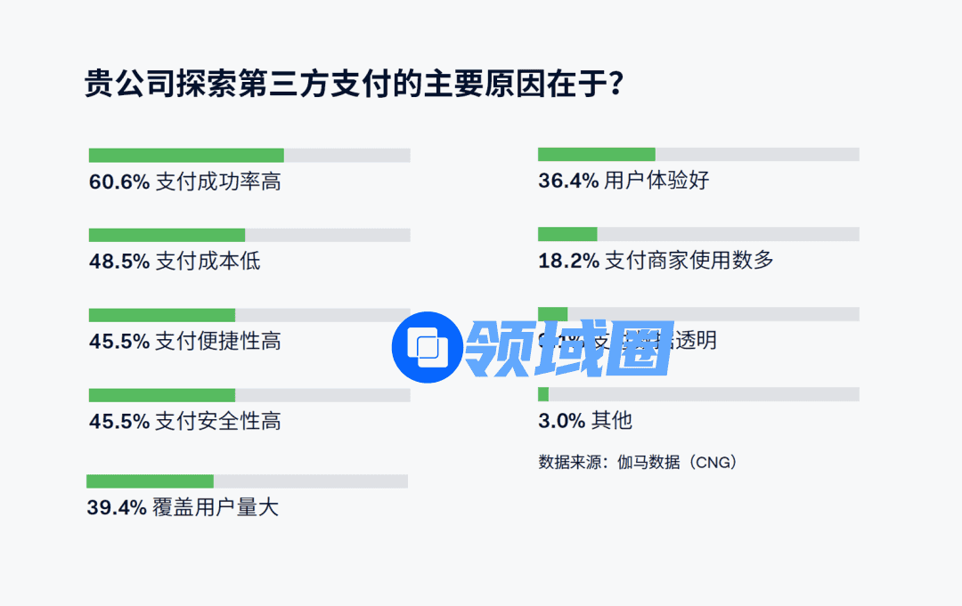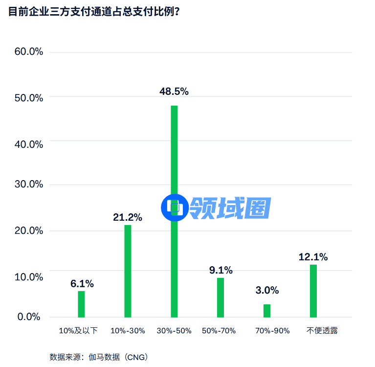 同时,三方支付通道如今已经成为了游戏企业应对复杂出海环境的首要选择,这主要得益于第三方支付更加注重为游戏企业提供定制化服务,且具备较高质量的服务响应能力。本次调研结果显示,在游戏企业目前的支付份额中,有六成游戏企业的三方支付通道占比超过了30%。