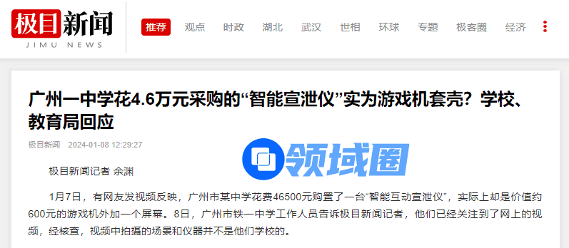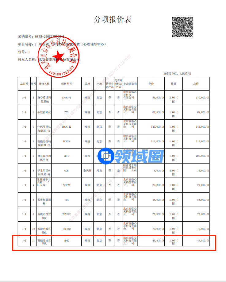 视频评论区中多位网友指出,购置该仪器的单位为广州市铁一中学,并贴出了广州市铁一中学的采购分项报价表,报价表显示,该台“智能互动宣泄仪”单价为46500元人民币,制造商名称为北京市瑞格心灵科技有限公司。