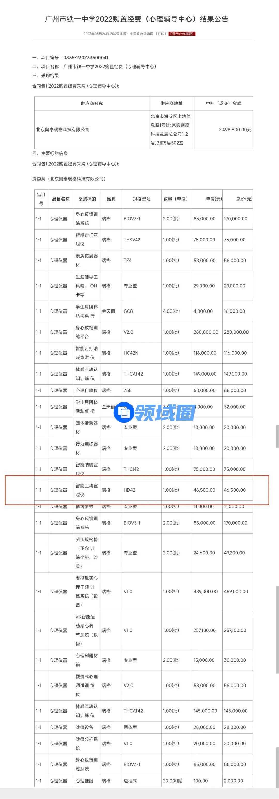 根据中国政府采购网的采购公示信息,广州市铁一中学确有按46500元的采购价采购“智能情绪宣泄仪”,该采购单项属于《广州市铁一中学2022购置经费(心理辅导中心)》采购项目合同包1,项目成交总金额为2498800元。