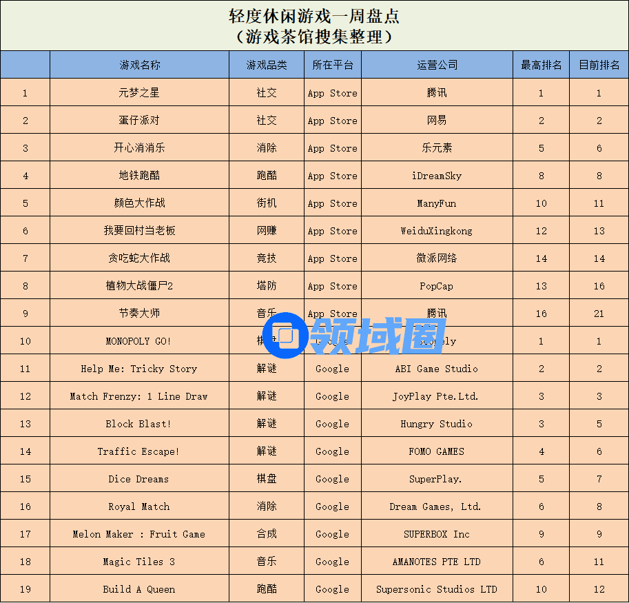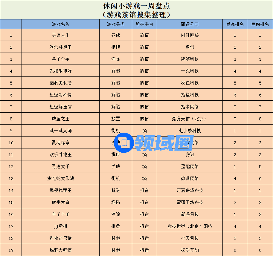 休闲新游周报每周统计微信小游戏、QQ小游戏、抖音小游戏、硬核小游戏以及App Store和Google Play上的新游爆款,并按照分类制作表格,将游戏排名情况等信息公布,希望给到行业同侪帮助。