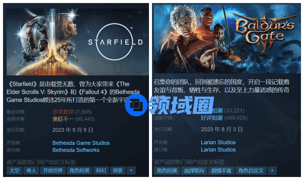 在Steam上,《星空》好评率约为63%,“褒贬不一”。而《博德之门3》却收获了96%的好评率。