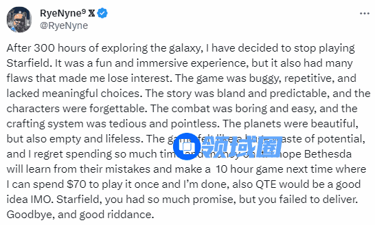 一名名叫RyeNyne的推友表示,在探索了300个小时银河系之后,决定不再玩《星空》了。