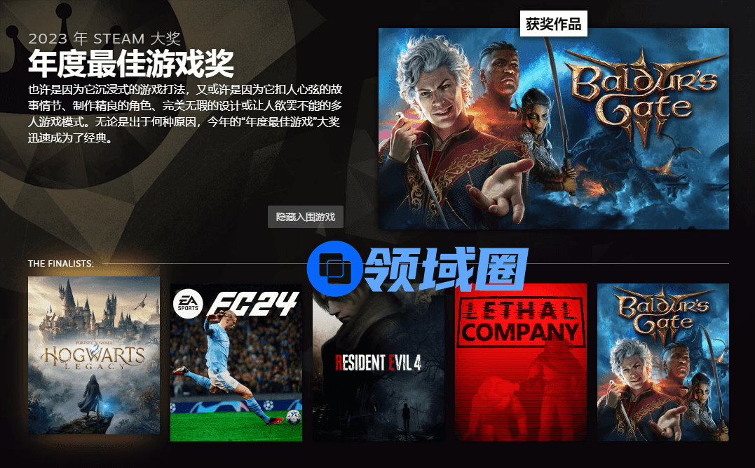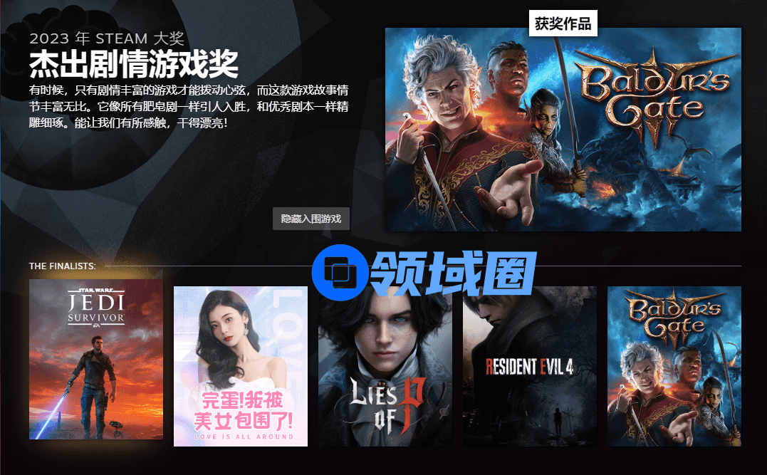 Steam今天公布了2023年的Steam大奖获奖名单,《博德之门3》毫不意外地获得了年度最佳游戏,顺便还薅走一个杰出剧情游戏奖。