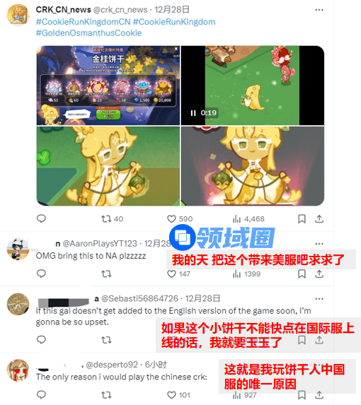 更值得一提的是,该游戏专门为国服玩家准备的“金桂饼干”刚刚上线,便吸引了大量游戏玩家的关注和讨论,甚至还有很多国际服玩家,扎堆到海外社媒平台上的喊话留言:我们也要金桂饼干!