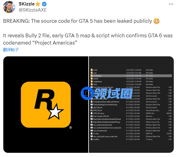 一名名叫SKizzleAXE的YouTuber 在 X 上分享了有关这次泄露的截图,该文件包大小约为4GB,包含大量RAGE引擎、概念和参考图像,相关截图中了还出现了与游戏早期地图相关的《GTA5》源代码。截图还透露《GTA6》之前的代号是“美洲计划(Project Americas)”。