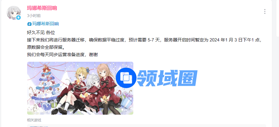 今日,二次元游戏《玛娜希斯回响》国服官方宣布,将在2024年1月3日开启服务器,他们预计在近期用5-7天的时间进行服务器迁移工作,这也是在今年2月份游戏“停更”后,官方首次对外发声。