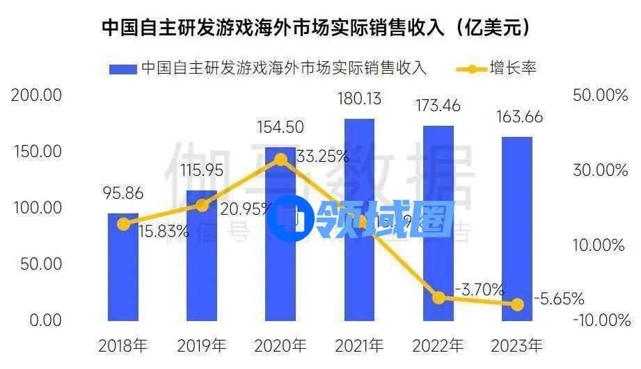 2023年中国自主研发游戏海外市场实际销售收入达163.66亿美元,出海收入继去年延续下降,其原因主要在于海外地区移动游戏市场整体收缩,进而导致中国游戏收入也随之降低。