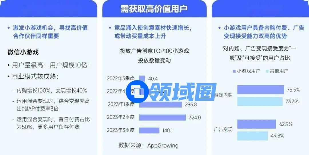 此外,伽马数据认为,未来小游戏领域将呈现至少三项趋势:第一,小游戏领域仍存机会,这是由于激活其潜力的因素仍然存在,即质量提升、买量成本较低、跳转链路更完善、多潜在用户 ;第二,付费优化将成创收重点,这是由于小游戏用户具备内购付费、广告变现接受能力双高的优势,但对付费点、付费项目的要求与App版本有差异,因而能更早完善产品调优的团队将具备优势;第三,小游戏将更快进入高价值用户竞争阶段,这是由于竞品增加进而快速拔高获客成本,因而如果无法获取更多高价值用户,产品利润或将更快的被成本抵消。