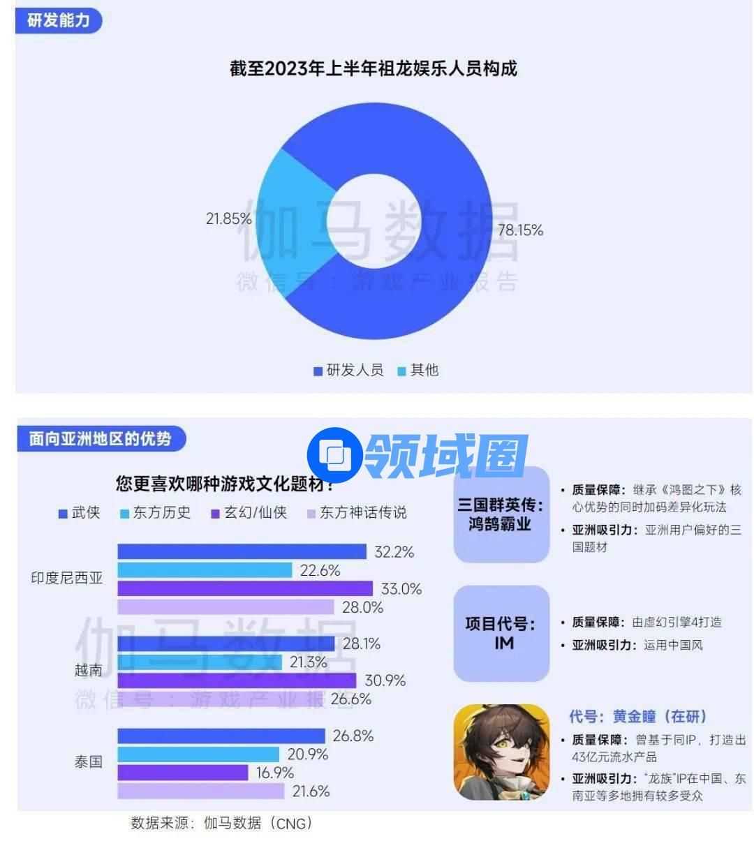 “强研发能力”是祖龙娱乐的固有优势,从市场来看,这一优势的潜力正逐步变现:《以闪亮之名》带动企业收入显著增长、《阿凡达:重返潘多拉》已进行6次测试迭代逐渐完善,预计随产品进入上线周期,将凭借头部引擎及更优的画面表现提升企业营收等级。研发能力的基础上,祖龙娱乐有望将亚洲地区塑造成其深入的优势地区,从新品布局及发行地区来看,祖龙娱乐更擅长的三国题材、“龙族”IP等均在亚洲地区拥有较高知名度,而产品选择的样板地区也多为东南亚,能为后续于中国、日本、韩国等高收入市场的上线提供高价值调优方向。值得注意的是,伽马数据认为长期来看,祖龙娱乐深入的优势地区并不限于亚洲,而凭借特色题材打通单一地区的经验,将成为企业深入更多地区的重要基础。