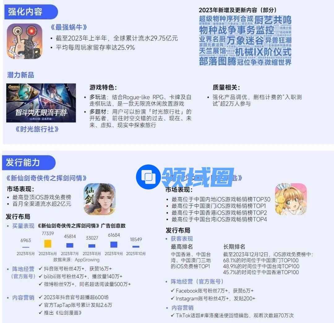 在强化内容的基础上,持续迭代多元的发行能力是青瓷游戏的重点潜力。其中,内容塑造主要体现在《最强蜗牛》《使魔计划》等自研产品中,其中以《最强蜗牛》最为突出,在上线3年的情况下仍保持着上半年月均流水约3500万元、周均用户留存率超25%的成绩,而为实现这一成绩,《最强蜗牛》也保持着较高的内容更新频率。现有产品之外,自研新品《时光旅行社》的长期表现也值得关注。发行能力也是青瓷游戏的潜力之一,《新仙剑奇侠传之挥剑问情》首月全渠道流水超2亿元、《魔卡少女樱:回忆钥匙》在中国港澳台iOS游戏畅销榜最高均位于TOP5等的表现,是发行能力的直观体现。但从更深层来看,产品成绩或存在必然性,这是由于上述成绩是在买量、内容营销、阵地经营等合力下形成的,即以更立体的发行能力加深用户印象、渗透用户圈层。在内容能力、发行能力的双重加持下,未来,青瓷游戏或助更多产品释放流水潜力及品牌价值。