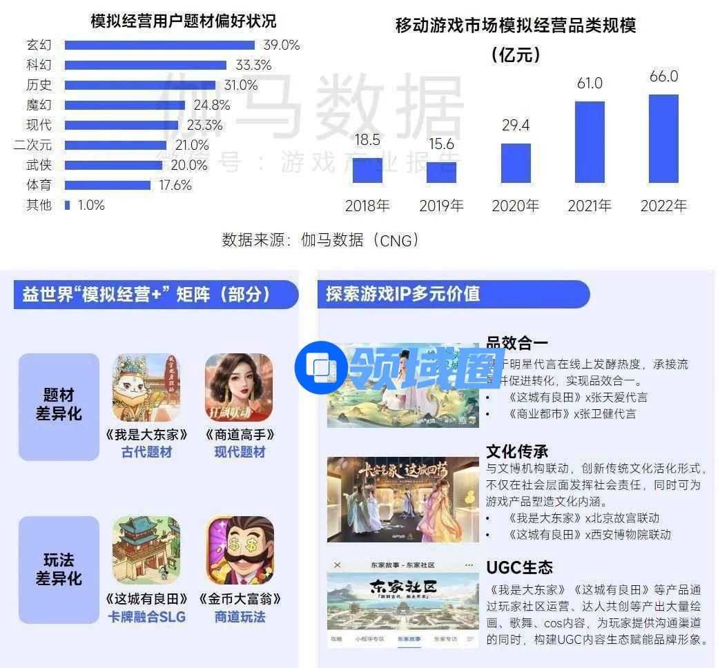 益世界或借力差异化实现细分赛道突围,提高潜力上限。模拟经营品类市场规模自2020年迅速上涨,2022年已达66亿元,而益世界在模拟经营品类持续深耕,孵化出《金币大富翁》《我是大东家》等多款长线运营产品,在模拟经营赛道中位列头部地位。在包含模拟经营元素的产品品类及题材愈发多元化的趋势下,益世界通过玩法、美术、题材的横向拓展多方向发掘细分市场潜在空间,例如现代商道类产品《商道高手》、策略经营类产品《这城有良田》等。值得注意的是,受海外模拟经营的融合玩法较单一的影响,益世界“模拟经营+”的布局在海外或同样有效,《商道高手》在日本市场长线运营已展现部分潜力。同时,多款差异化模拟经营产品也帮助益世界建立起立体的“模拟经营+”品牌形象。此外,益世界不断发掘旗下产品IP价值,以品效合一、构筑UGC生态等形式塑造原创IP,有望在细分品类中激发更长远的潜力。