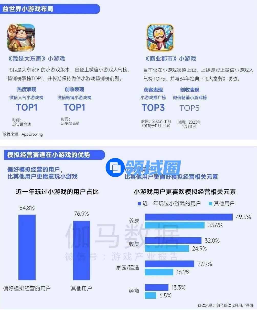 小游戏或成益世界新兴潜力。布局深度上,《商道高手》《这城有良田》《我是大东家》均为App+小游戏双端发行,双版本并行或成益世界长期发行战略,也意味着益世界对小游戏赛道的重视。布局成果上,无论获客还是创收层面《商业都市》《我是大东家》两款游戏均位于前列,这意味着在小游戏领域益世界已沉淀部分方法论。未来,益世界或进一步结合小游戏赛道与模拟经营优势,实现优势品类与优势渠道的同步增长。