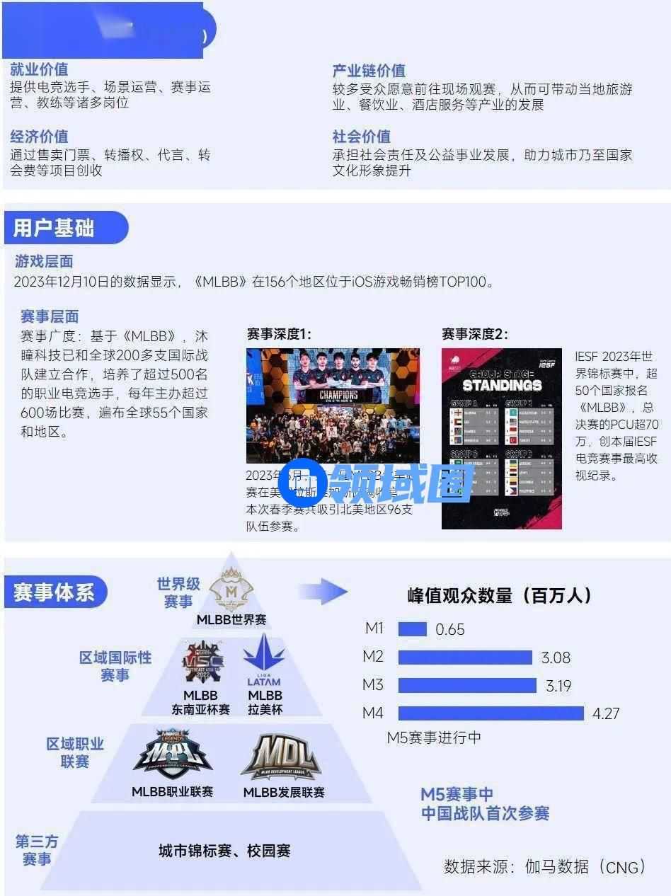 电竞全球化是沐瞳科技的核心潜力之一。作为新兴体育项目,电子竞技有望达到与足球、篮球等传统体育项目近似的知名度与品牌价值,因此,电竞全球化也是较多产品追逐的目标。而沐瞳科技的高价值则在于,旗下《Mobile Legends: Bang Bang》(以下简称《MLBB》)已实现更深层次的全球化,更接近了传统体育展现出的用户认知。更深层次的全球化主要体现在具备全球性用户基础、建立全球性赛事体系上。用户基础方面,《MLBB》已成功在东南亚、南亚、中亚、中东、拉美、独联体等地区获得大量用户偏好,还在印尼、新加坡、菲律宾、马来西亚、缅甸、柬埔寨、尼泊尔、孟加拉国、蒙古、土耳其、哈萨克斯坦、吉尔吉斯斯坦等10余个国家成为“国民游戏”。2023年12月10日的数据显示,《MLBB》在156个地区位于iOS游戏畅销榜TOP100,这意味着不局限于单一市场,较多地区的用户都会受到《MLBB》的影响,即无论是带动经济发展、强化社会责任还是其他领域,《MLBB》均具备全球性号召力;在此基础上,沐瞳科技以赛事体系串联全球用户,M5世界总决赛的覆盖广度达到了全球近50个地区,与之并行的是全球化的赛事体系研发,全球电竞赛事体系均由沐瞳科技研发意味着运营思路均注重本地化。而从全球性用户基础、全球性赛事体系的布局现状来看,沐瞳科技已位于国内头部,因而伽马数据认为电竞全球化是沐瞳科技的核心潜力之一。