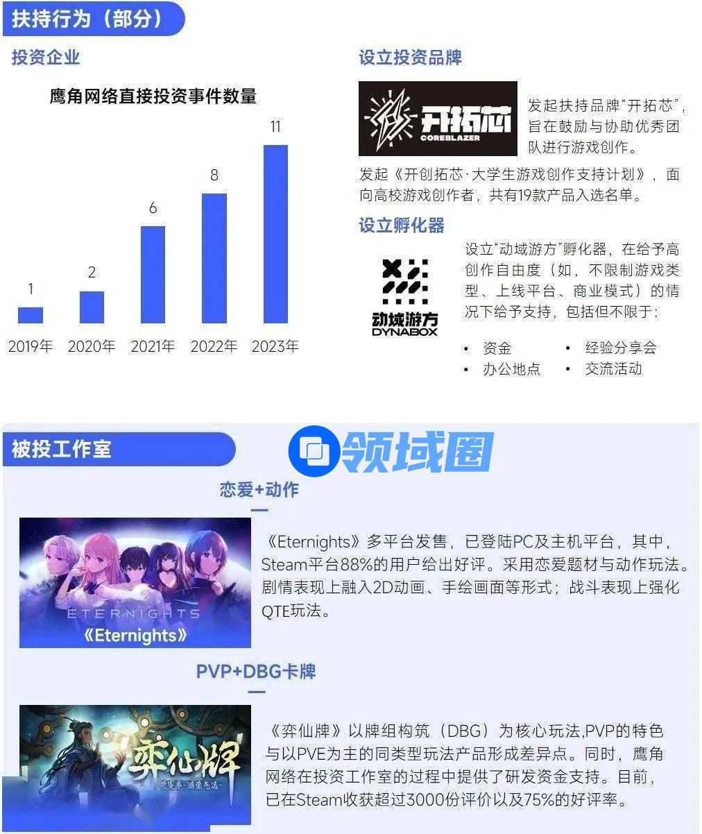 产业层面,鹰角网络对其他游戏团队保持着较大的扶持力度,虽然扶持的初衷更为纯粹与质朴,但伽马数据认为上述举措引发的连锁反应仍然具备商业价值。这是由于在精品化的趋势下,能占据细分赛道头部位置的企业及产品愈发向创新体验靠拢,代表方式如前文提及的玩法融合。因此即使规模尚小,被投团队同样有望在细分赛道甚至更广阔的领域产出高知名度产品。而鹰角网络的投资与帮扶有助于深化合作,此外,鹰角网络也将与更多创作人才、创新团队建立连接,将自身经验及资源传递给被投团队,进而加速被投企业的成长与成功。