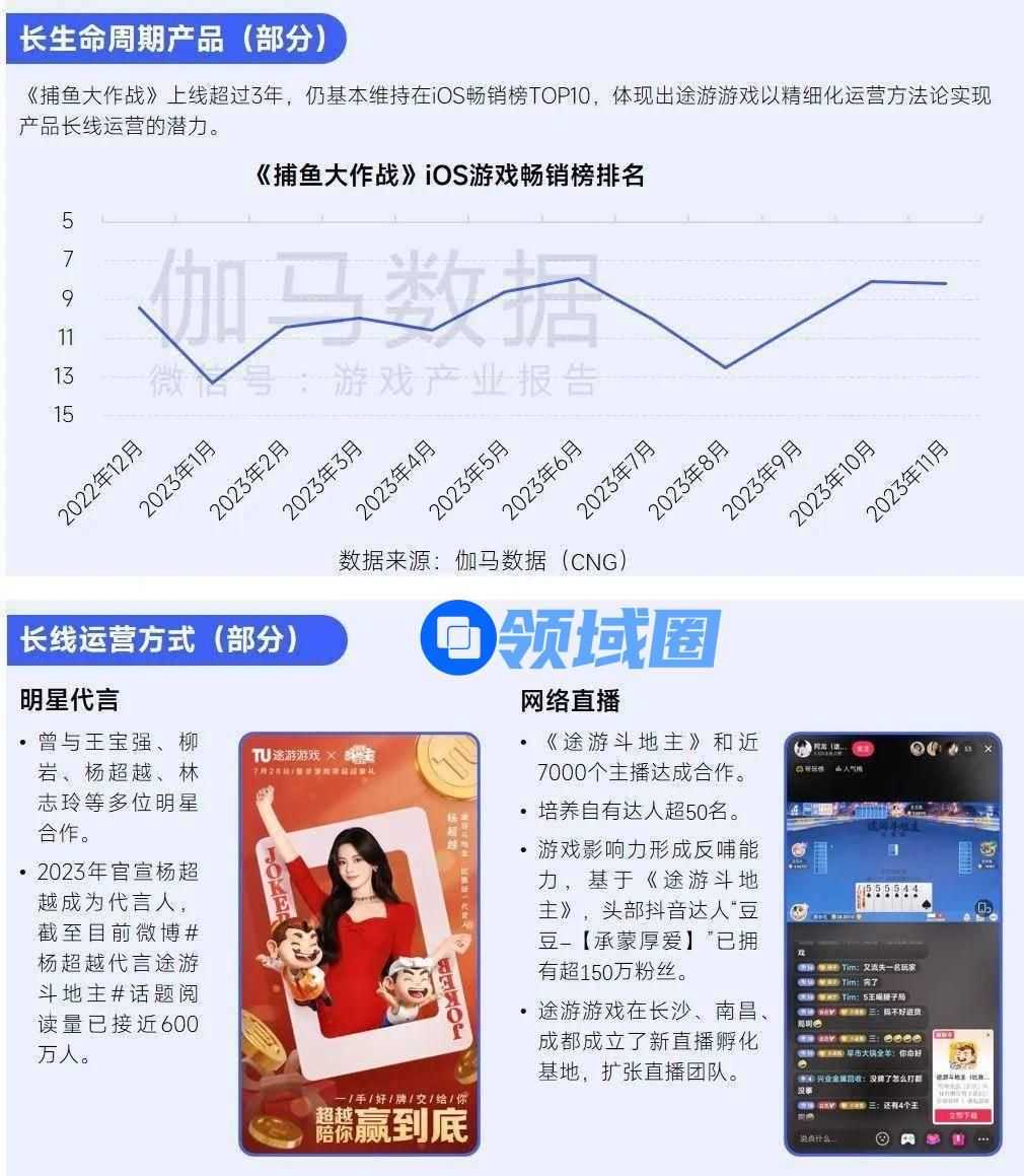 长线运营方法论或为途游游戏的潜力之一,从成果来看,途游游戏专注现有品类并强化精品化研运,例如《捕鱼大作战》《次神:光之觉醒》为代表的产品均在各自的品类中表现较优,生命力稳定且仍处于健康状态。从长线运营方式来看,“经典运营方式全面探索用户圈层,新兴运营方式快速挖掘精准流量”是较显著的特点,经典方式的代表为明星代言,企业联动柳岩、杨超越等多位明星;新兴方式的代表为直播、短视频,培养自有达人超50名。基于经典方式与新兴方式,途游游戏在发行上持续探索精细化营销及运营,从结果来看,或已沉淀出多品类的有效方法论。当前,途游游戏的重点关注赛道在休闲类、策略类、小游戏领域,当产出研发层面较强的产品后,结合已沉淀的方法论,或有望长期保持高流水,带动企业收入持续稳定地增长。