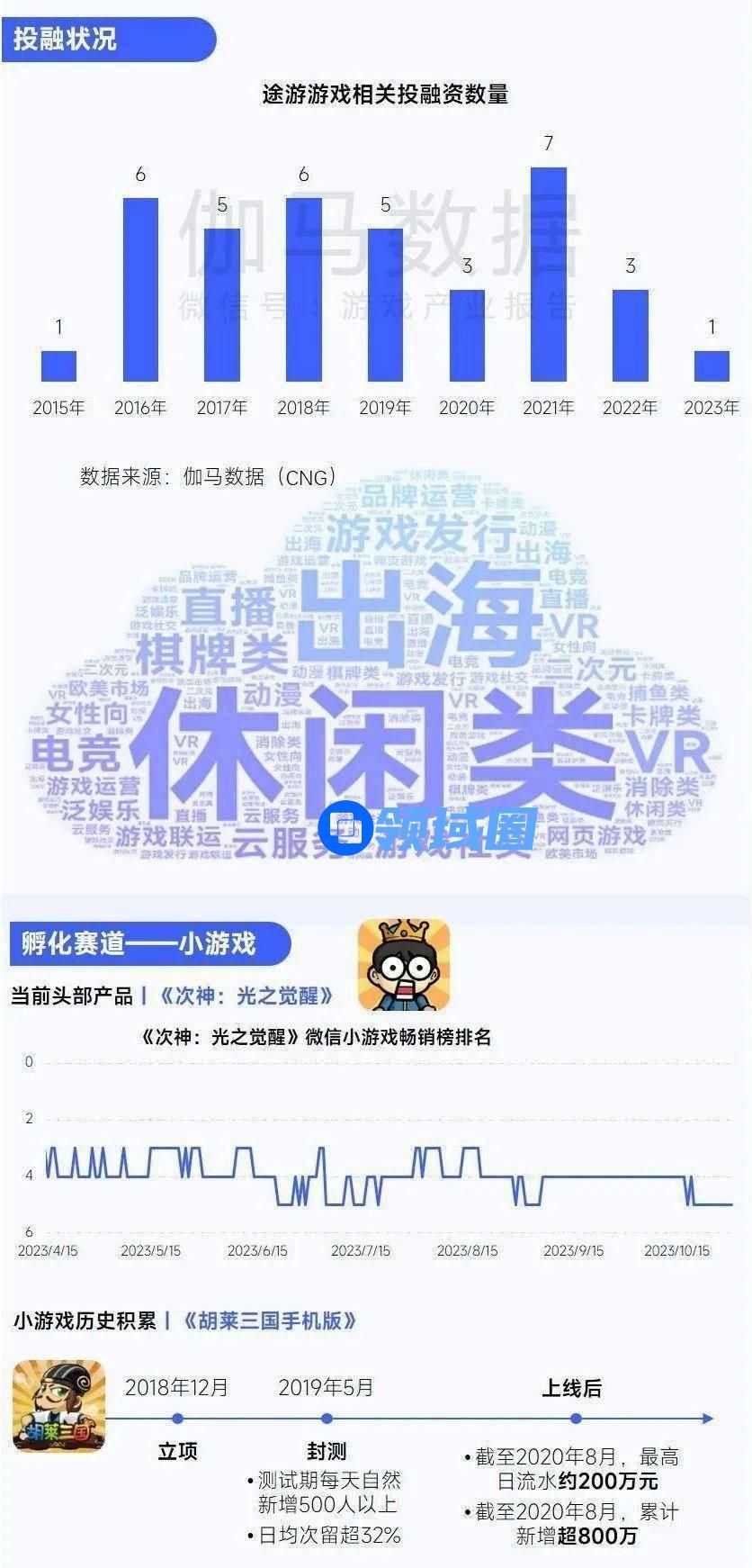 途游游戏通过企业投资探索多品类赛道,从而释放潜力。多品类机会的价值主要体现在两点,一方面,通过投资直播、泛娱乐、品牌运营等领域,形成更为成熟全面的大发行能力体系。另一方面,在投资企业与途游游戏的合力下迈入新的优势赛道,现阶段,小游戏赛道是这一思路的典型代表,凭借《次神:光之觉醒》,途游游戏兼具了小游戏热度带动者与头部玩家的双重身份。值得注意的是,《次神:光之觉醒》的市场表现存在“必然”的成分,这是由于虽然小游戏于近年爆发,但途游游戏的预判更为前置,例如于2018年控股《次神:光之觉醒》研发企业、2018年以《胡莱三国手机版》深入小游戏。而从其在小游戏研发、发行能力的积累来看,伽马数据认为《次神:光之觉醒》的市场表现,或仅为企业小游戏潜力大规模变现的开端,未来或有更多高流水产品产出。