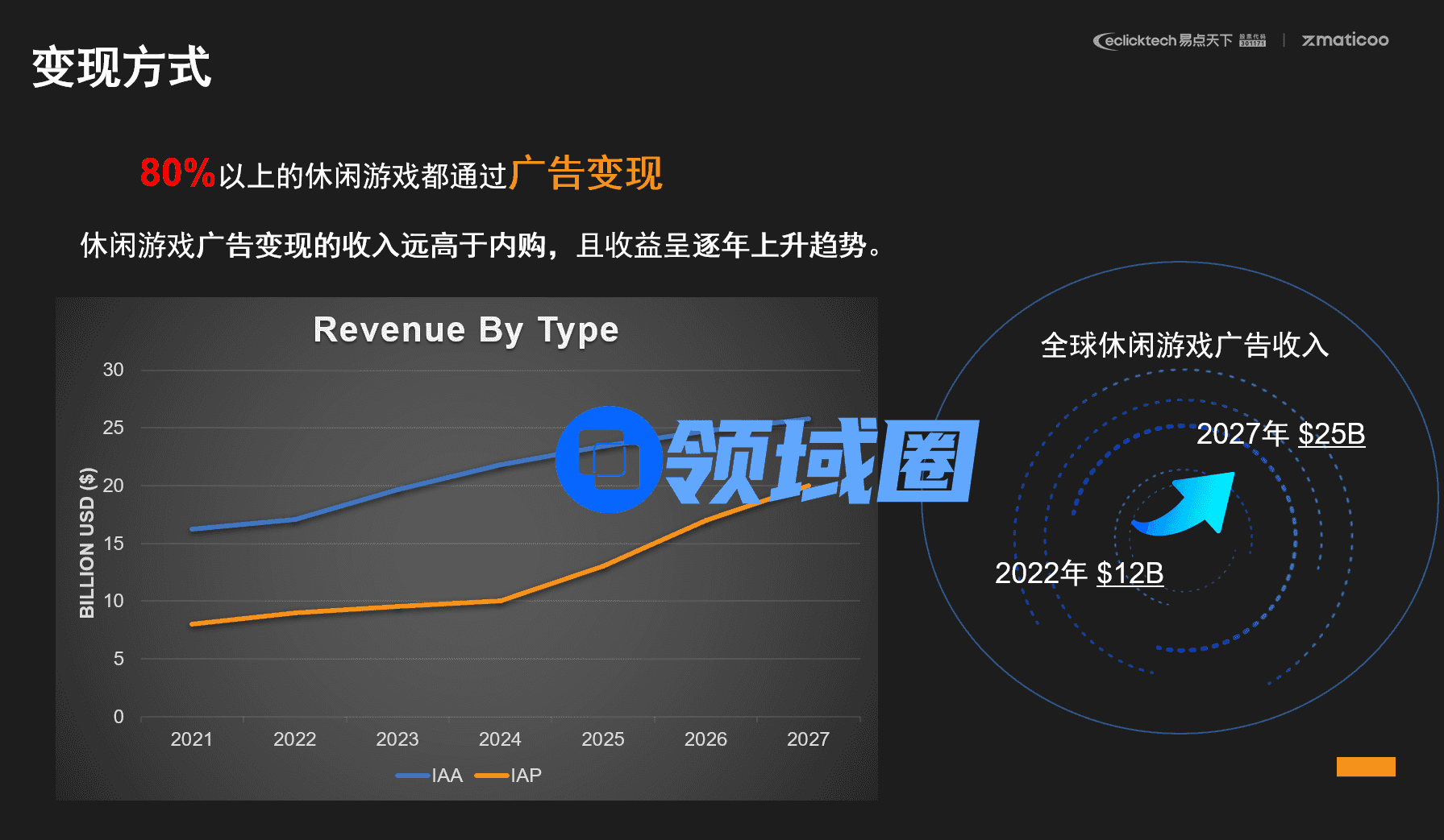 以《Save the Doge》为例,作为Wonder Group值得信赖的合作伙伴,zMaticoo结合全球市场洞察及大量实践经验洞察到,约80%以上的休闲游戏都是通过IAA(In-App Advertising)模式进行变现,且从收益角度看,IAA变现的收入远高于IAP(In-App Purchase),且收益呈逐年上升的趋势。
