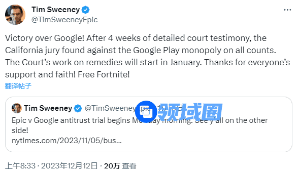 Epic Games CEO Tim Sweeney今早在 X 平台发文称,Epic打赢了与谷歌的反垄断官司。