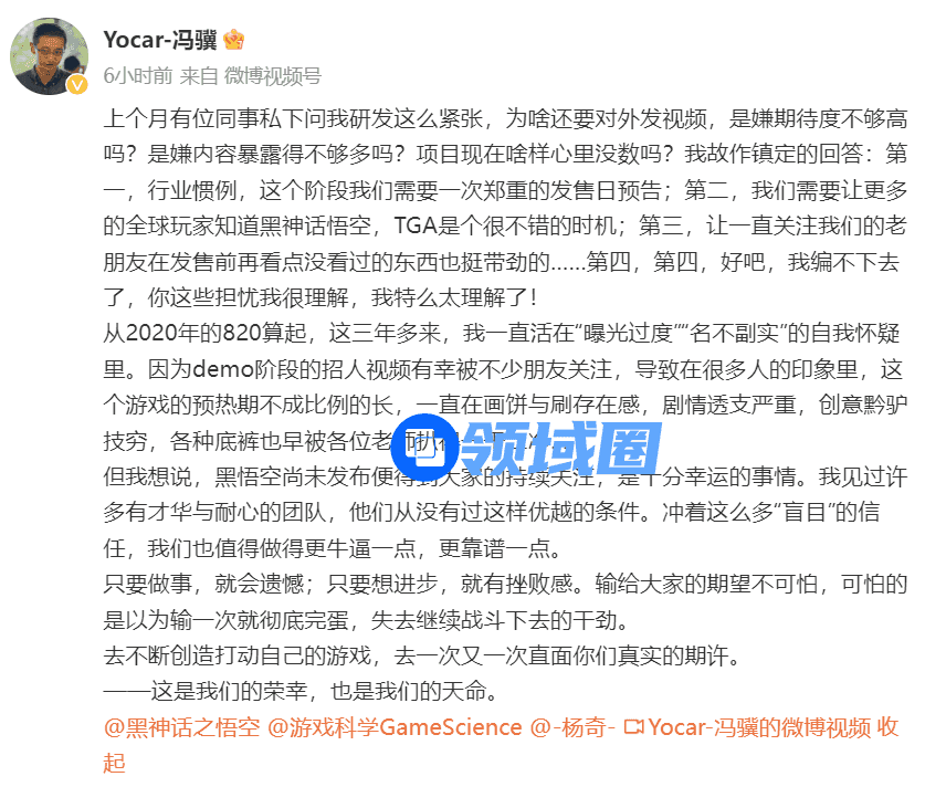 而在TGA发布全新预告之余,游戏科学美术总监杨奇和CEO冯骥在微博上发文,直言“曝光过度的焦虑一直存在”。
