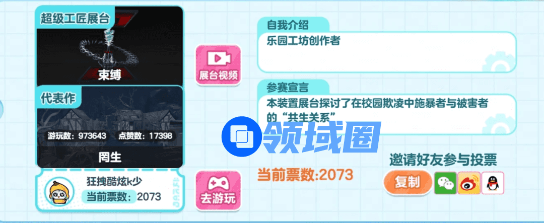 同样地,延续蛋仔 UGC 关注社会议题的创作传统,本次的工匠们也将创作视野延伸到了「校园霸凌」、「心理疾病」等话题,实现社会话题与创作艺术的深度融合。如「束缚」展台从当代装置艺术中汲取了灵感,用抽象元素解构热点话题,探讨了校园欺凌中施暴者与被害者之间的「共生关系」。