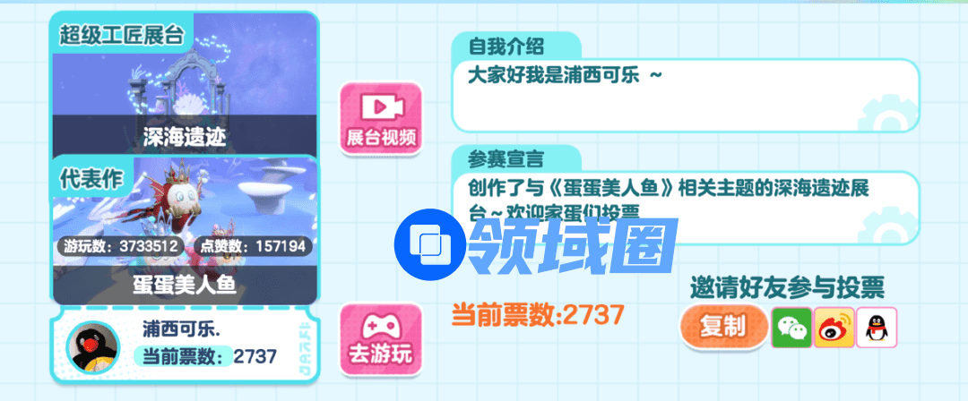 这一次,两人都带来自己的精美展台,「浪浪11」精心绘制了天使版蛋仔,萌态十足令人怜爱,而「浦西可乐.」搭建的「深海遗迹」展台,则将大家带到了蔚蓝神秘的海底世界,极具艺术审美特色。
