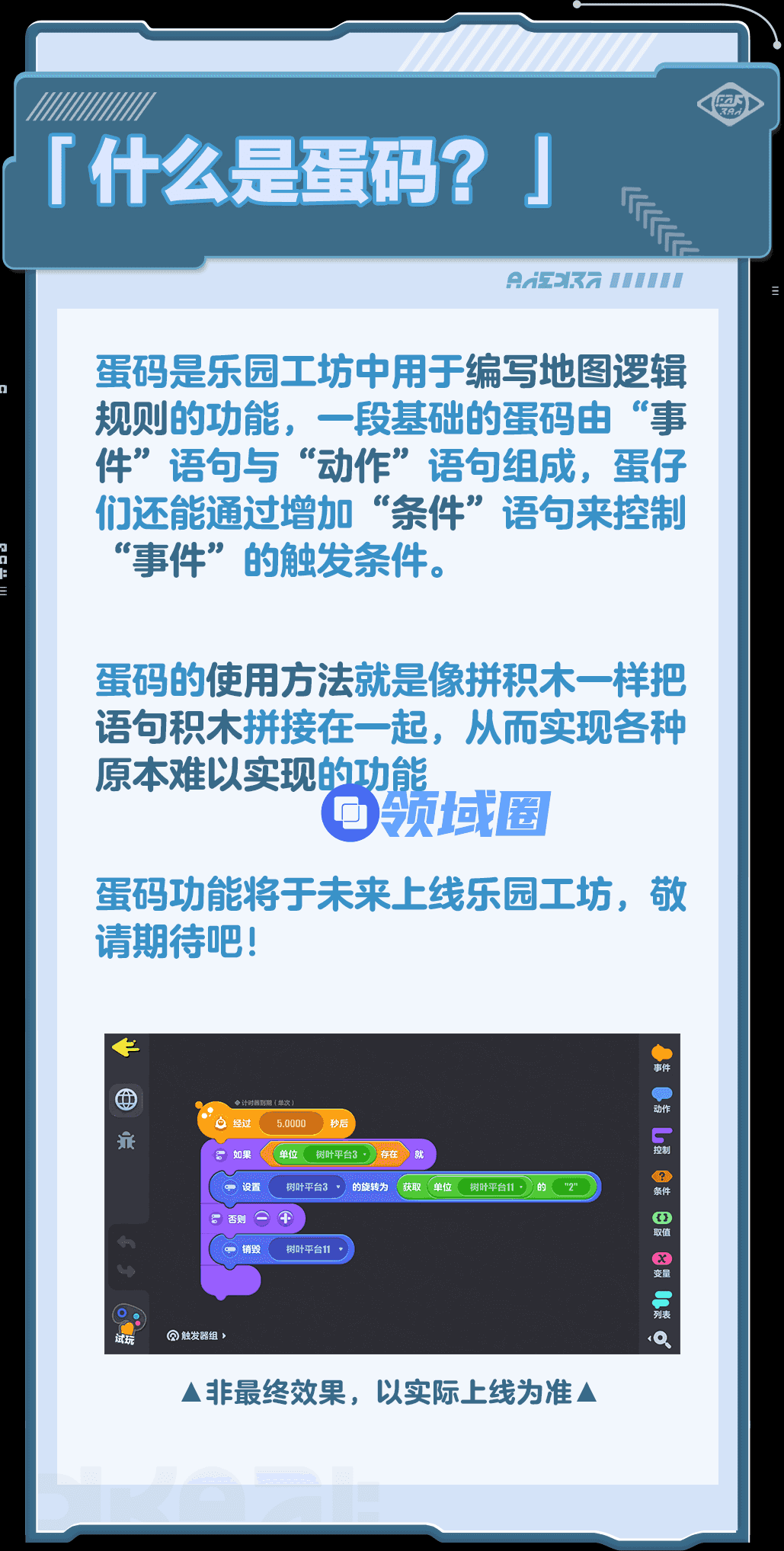 比如「蛋码」通过「事件」、「动作」和「条件」语句的极简拼接操作,下放创作权限,将标准化游戏研发要素无条件分享给用户,让创作者实现更高阶的内容创作。