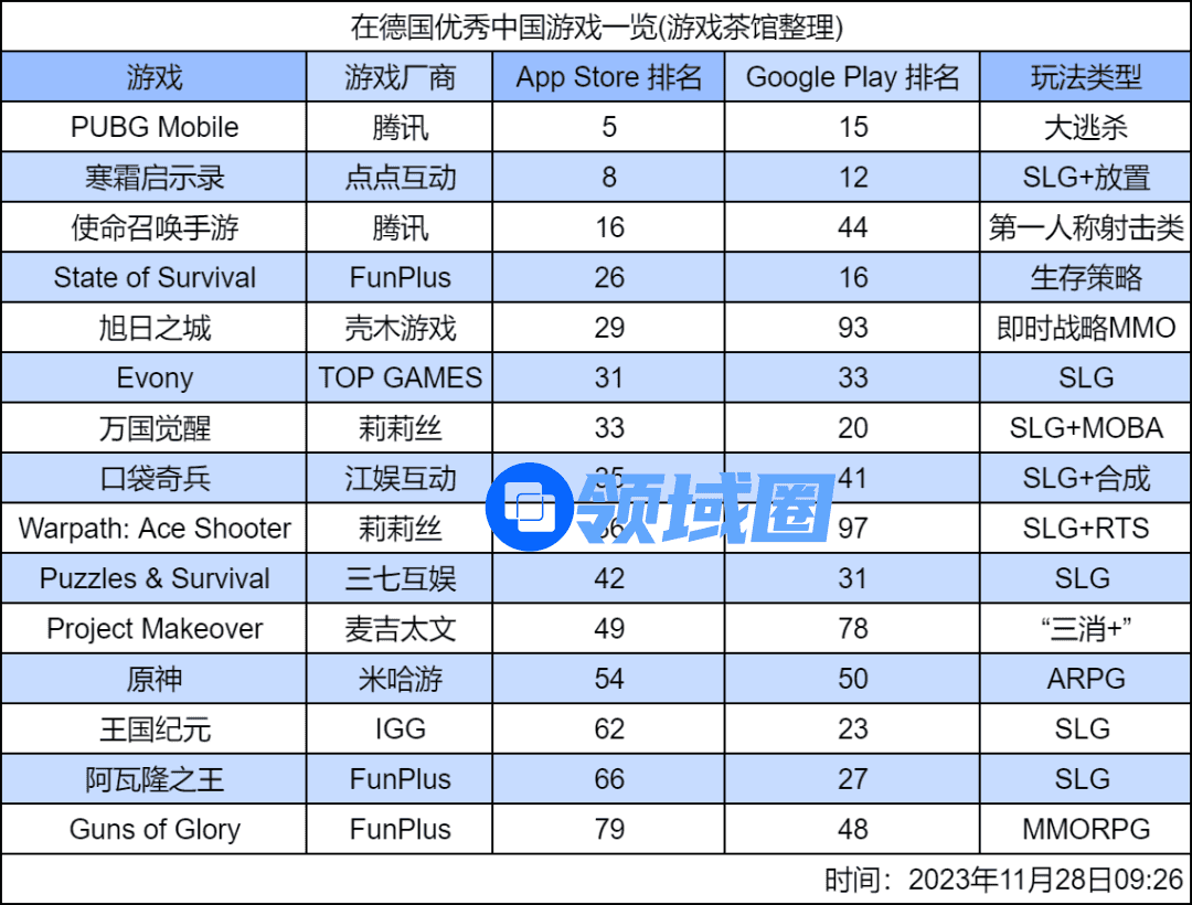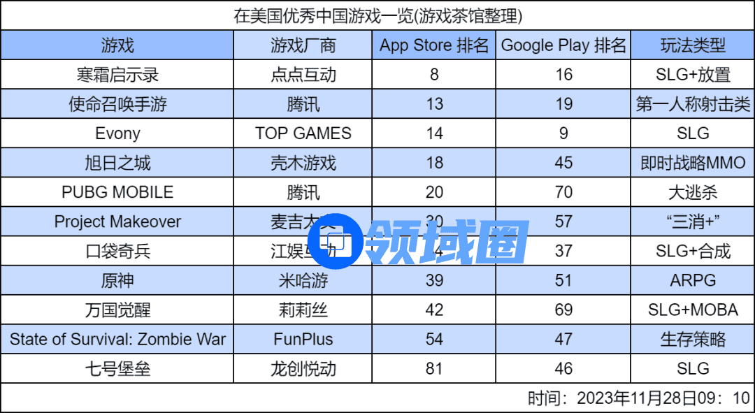 从整体来看,在本期欧美出海秀榜单上露面依旧是SLG领域的“熟面孔”。其中,点点互动的《Whiteout Survival》(寒霜启示录)和腾讯的《PUBG Mobile》分别是美国、德国游戏畅销榜中的国产手游No.1。