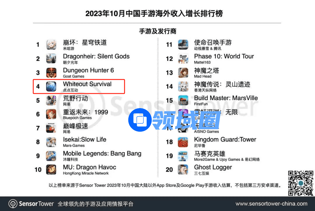 据点点数据预估,凭借《寒霜启示录》,点点互动在发行商出海收入榜单中超越腾讯来到第二名。
