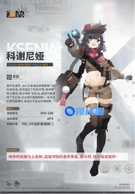 在日常生活中,离开格里芬并加入卫星城治安管理部门的科谢尼娅,既是一位积极的赚钱小达人,也是一位狂热的购物爱好者。"赚来的钱要马上花掉,这是对钱的基本尊重,要不然,钱可是会哭的~"。这不仅是科谢尼娅的日常口头禅,也是她的生活准则。但如果大家误以为科谢尼娅眼里只有金钱,那可就大错特错咯!当自己的伙伴遇到困难时,科谢尼娅一定会毫不犹豫地伸出援手哦。抱持着如此独特的金钱观和购物哲学却又有情有义值得信赖,这也让科谢尼娅成为了众多角色中的一股清流,让人忍不住心生好感。