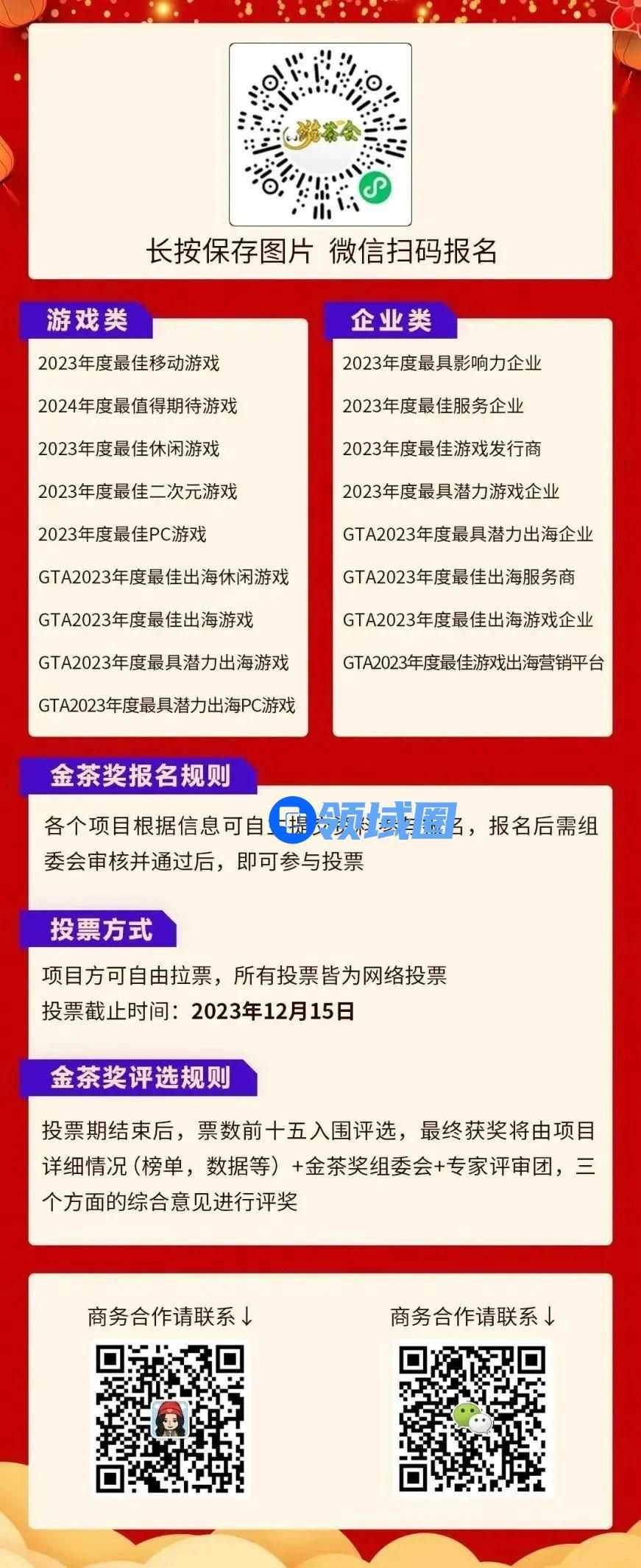 本届金茶奖盛典共设立9个奖项,以此评选出今年最具代表性的产品和优秀企业,其中年度最佳PC游戏奖为新设立奖项,来表彰今年的爆款PC产品。GTA出海峰会设立8个奖项,主要聚焦常年在海外市场奋战的优秀国内企业。目前,两个奖项依旧在火热报名中,期待各位的参与和莅临。