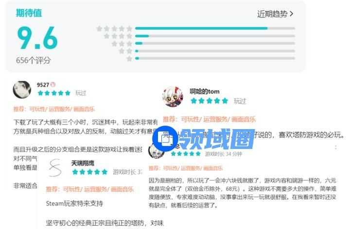 《气球塔防6》开测已有5天,游戏评分目前稳定在9.6分,玩家评论多为对可玩性的认可。