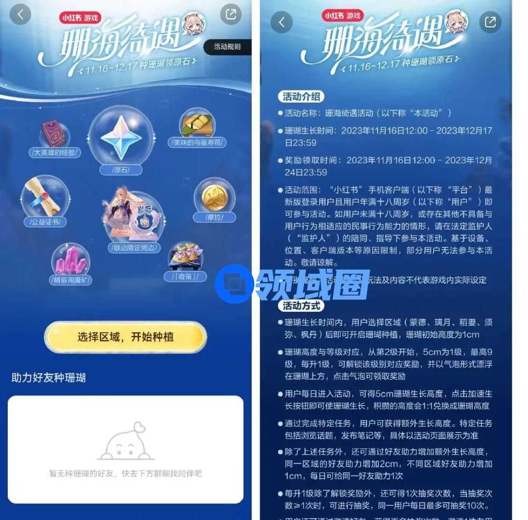 除了通过各种内容与平台之间合作造福玩家,小红书和《原神》还联手进行公益,共同发起了“珊瑚绮遇公益计划”,通过简单的小游戏寓教于乐,让更多人关注并参与到珊瑚生态保护中来。在公益活动期间,《原神》和小红书还为玩家准备了联动周边、原石等游戏道具奖励。