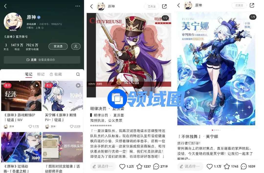 早在2年前,《原神》官方账号就已经登陆小红书。经过精心运营,目前该账号已经积累了超140万粉丝关注,发布的官方素材也总能在小红书上获得亮眼的数据和玩家反馈,与角色相关的重点素材几乎条条点赞都能破万,其影响力可见一斑。