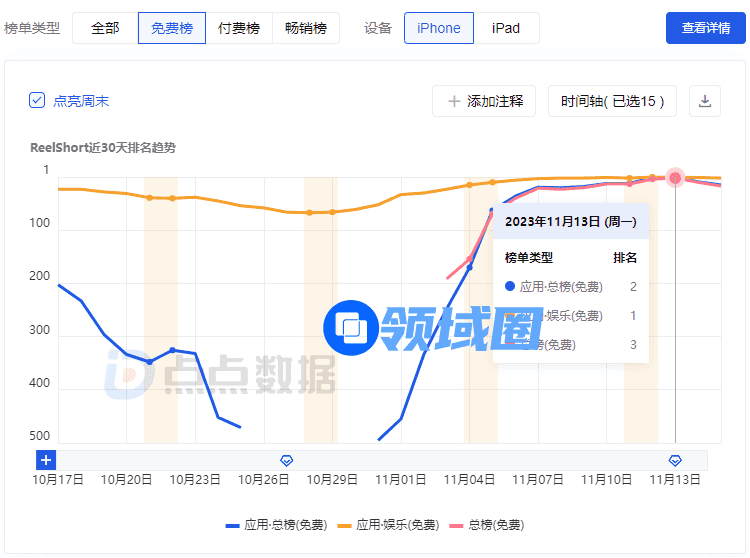 据显示,Reelshort在11月13日,超过TikTok登顶美国App Store娱乐榜,同时跻身App Store免费榜第三名。