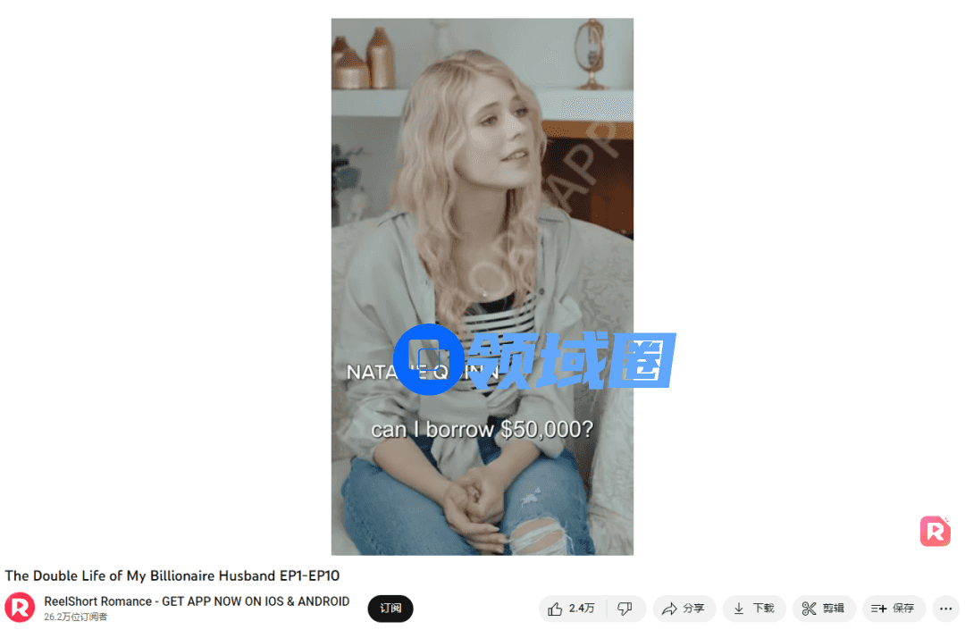 ReelShort也同时贴心地在官方YouTube频道放出了前20集供免费观看,目前相关视频在Youtube的观看量超过900万。也不知道这900万人里有几成会通过YouTube成功转化成ReelShort的用户。