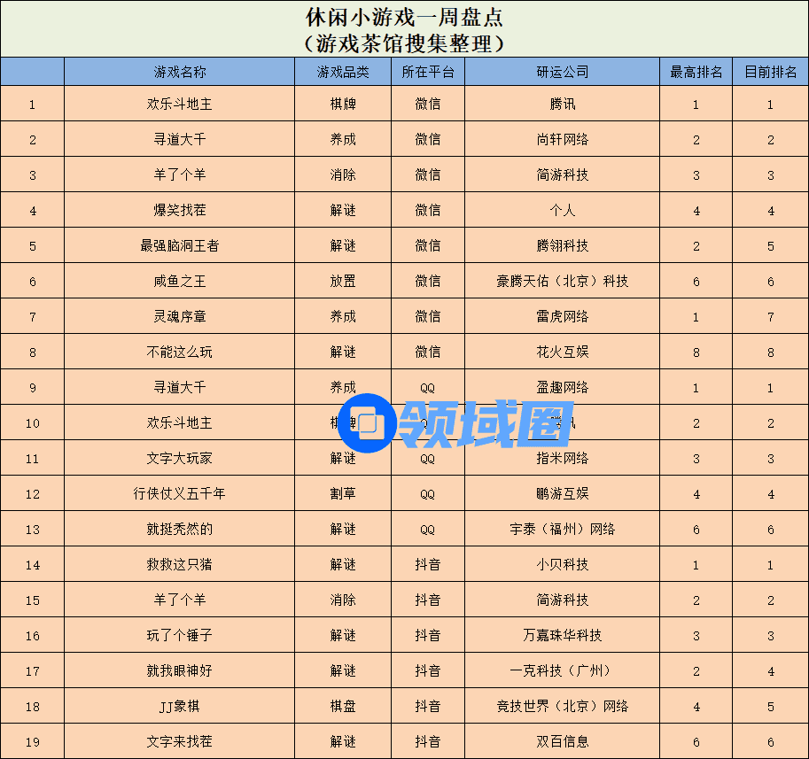 休闲新游周报每周统计微信小游戏、QQ小游戏、抖音小游戏、硬核小游戏以及App Store和Google Play上的新游爆款,并按照分类制作表格,将游戏排名情况等信息公布,希望给到行业同侪帮助。
