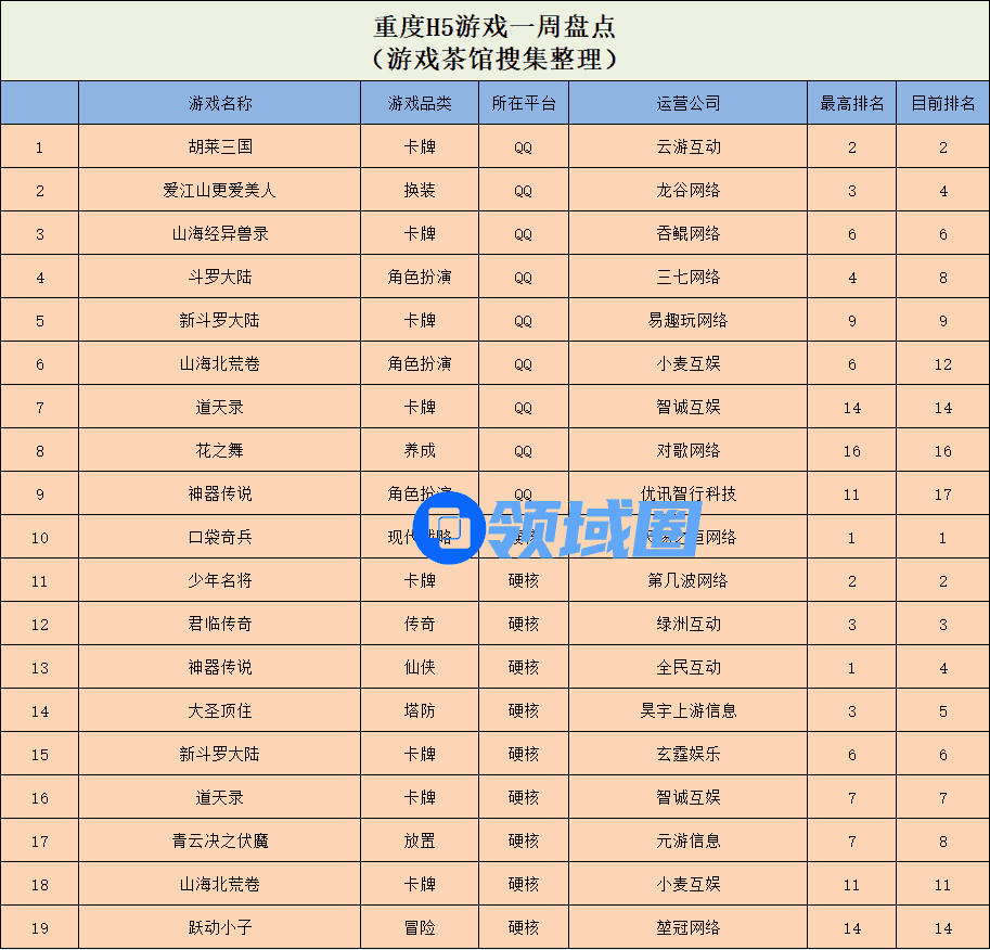 重度游戏方面,在QQ小游戏畅销榜单中,卡牌游戏《胡莱三国》重回重度榜单魁首,且其当前位于QQ畅销榜第2名,龙谷网络旗下的换装养成游戏《爱江山更爱美人》和吞鲲网络的卡牌游戏《山海经异兽录》则紧随其后,分别拿下了QQ小游戏畅销榜单第4名和第6名。同时,来自对歌网络的另一款换装养成游戏《花之舞》也在本周重回QQ畅销榜单前列,且其当前位于榜单第16名。