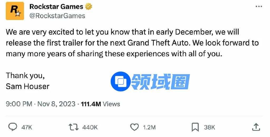 11月8日,R星发推文称,将在12月初发布下一款GTA的首部预告片。