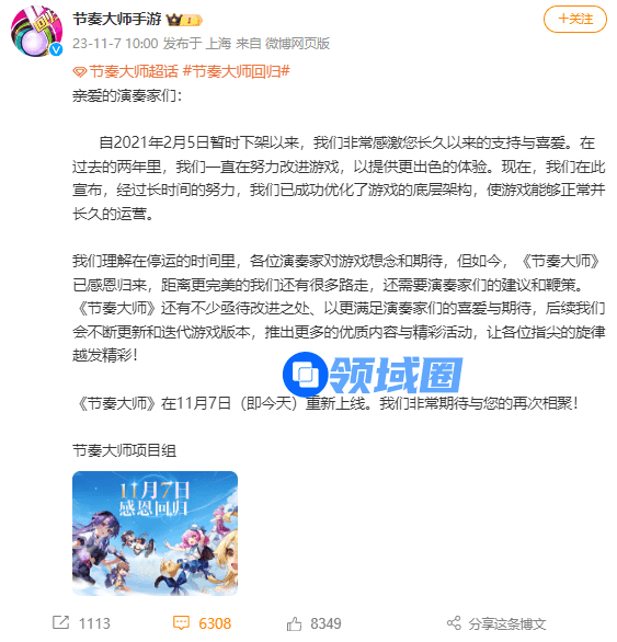 《节奏大师》手游今日宣布重新上线,全平台回归。官方发微博称“我们已经成功优化了游戏的底层架构,使游戏能够正常并长久的运营。”