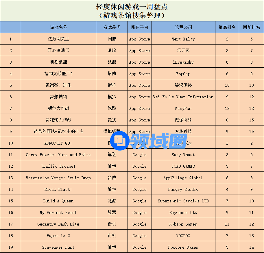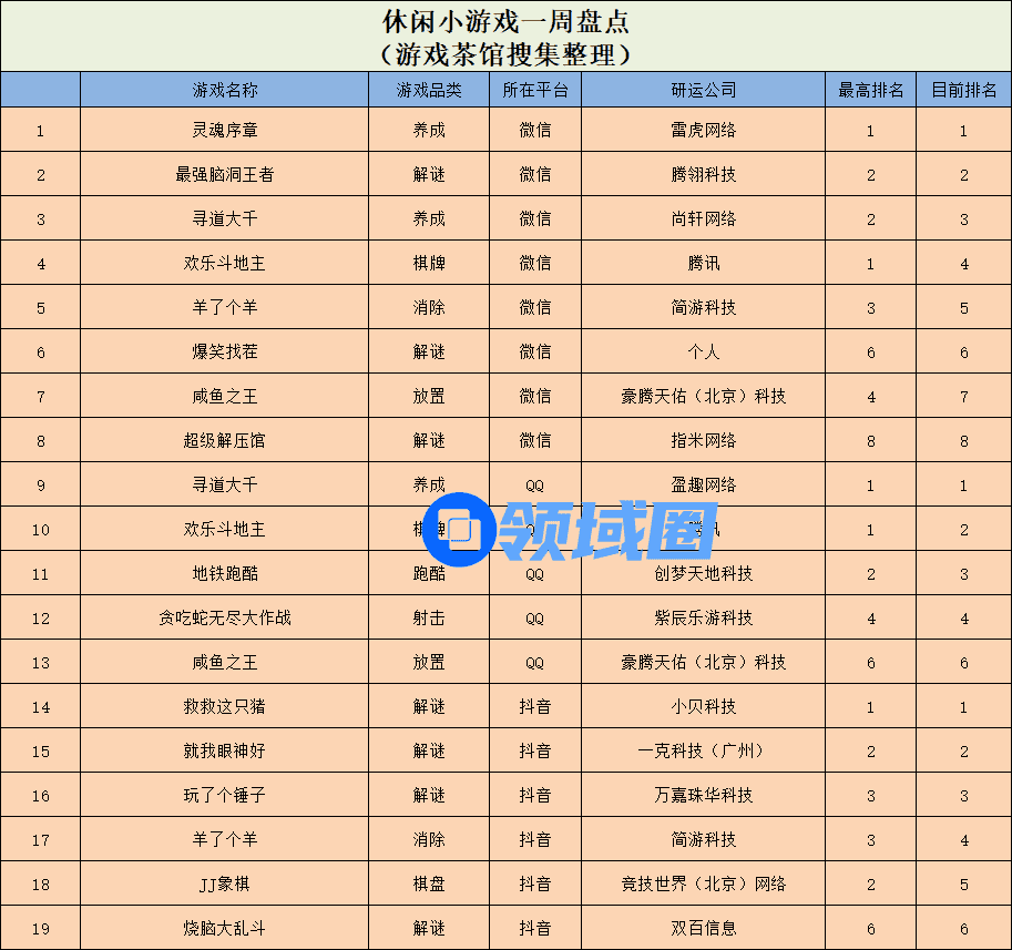 休闲新游周报每周统计微信小游戏、QQ小游戏、抖音小游戏、硬核小游戏以及App Store和Google Play上的新游爆款,并按照分类制作表格,将游戏排名情况等信息公布,希望给到行业同侪帮助。