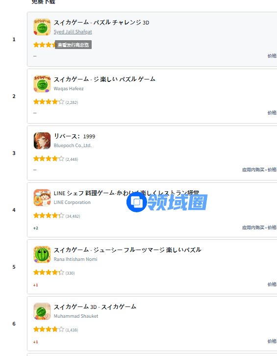 实际上,自从日区ns上面的一款“合成大西瓜游戏”《Suika Game》被主播们带火之后,“合成大西瓜”热度火速席卷海外更多国家和地区,颇有点国内当年盛况重演的气势。当然作为这波热度的中心,日本地区的合成热潮最甚,最夸张的时候,iOS免费游戏榜单TOP6中有4个席位都被“大西瓜”占据。