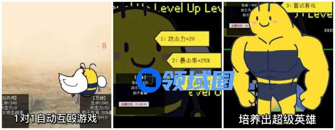 另一个“Bee兜子RPG”项目,觅2将其定义为一款1v1自动互殴游戏,玩家在每次过关后需要在三个升级选项中进行选择,只有选择正确了我们才能将小bee培养成超级英雄,并在最后打败最终大魔王。