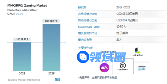 据Mordor Intelligence市场调研数据显示,MMORPG游戏市场规模预计将从2023年的233.5亿美元增长到2028年的384.7亿美元。这个预测,对于近年存量市场博弈激烈的游戏行业来说,可谓是给了MMORPG一个非常强烈的增长讯号。