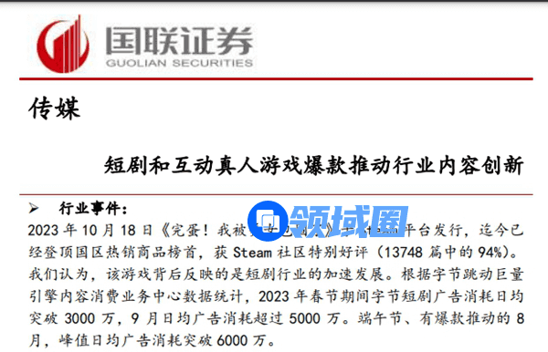 国联证券迅速发布研报,认为短剧ROI更高,周转周期更快。国联证券表示短剧市场规模庞大,推算规模达200亿以上,并处于快速增长期。这种形式创新的内容有望成为市场新的增长点,带动业绩增长。