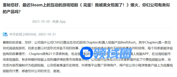有意思的是,真人互动游戏概念热快速发酵的过程中,散户投资者也在抓紧寻找尚未挖掘的的概念股。近日,就有个人投资者在互动易上向中文在线提问,询问公司是否有《完蛋!我被美女包围了!》类似产品。中文在线则介绍了公司出海产品《Chapters》和《ReelShort》。