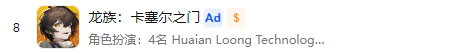 《龙卡》冲势迅猛,在9月12日上线后,首日获得免费榜第1、畅销榜第22的成绩;上线四日后,冲进畅销榜Top10,目前位居第8,成为近期国产游戏畅销榜Top10中的唯一“新面孔”。