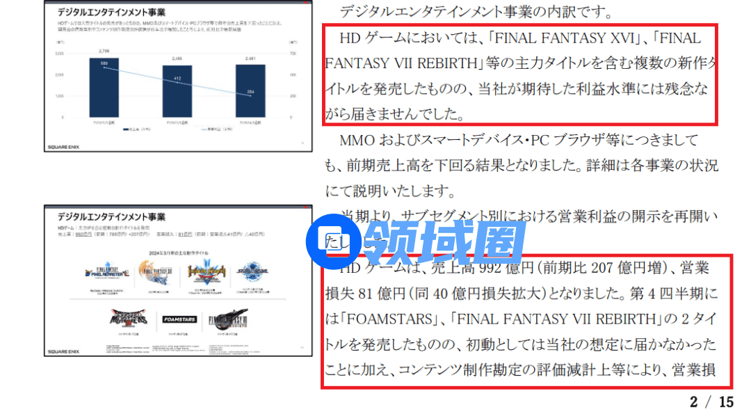 同时,SE披露其当期高清游戏业务营业亏损达81亿日元,与去年同期相比亏损扩大40亿日元。SE将亏损归因为《泡沫之星》与《最终幻想7:重生》首发销量不佳,以及MMO《最终幻想14》7.0资料片《黄金的遗产》发售前真空期收益下滑的影响。